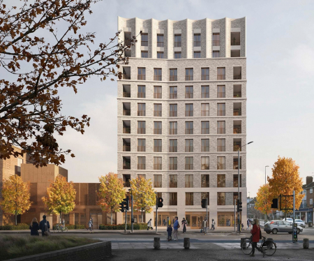 The scheme is tenure blind with a welcoming and high quality single residential entrance. In response to the Council’s declaration of a climate emergency, the Hub endeavours to exceed conventional sustainability standards. It is a LETI pioneer project and targets BREEAM Very Good. Planning permission was granted in October 2021.